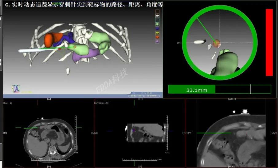 c. 实时动态追踪显示穿刺针尖到靶标物的路径、距离、角度等