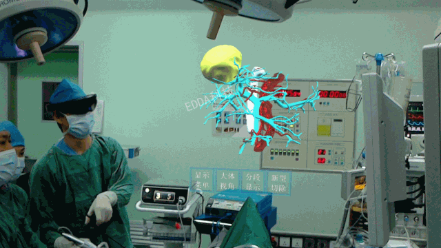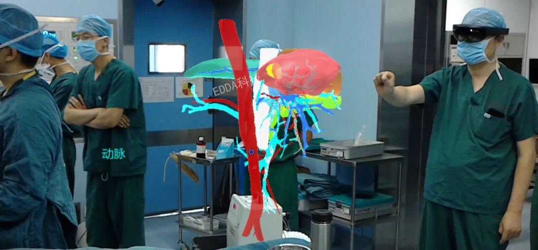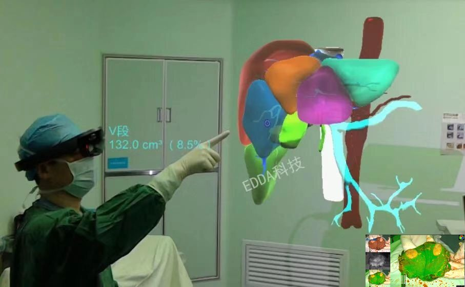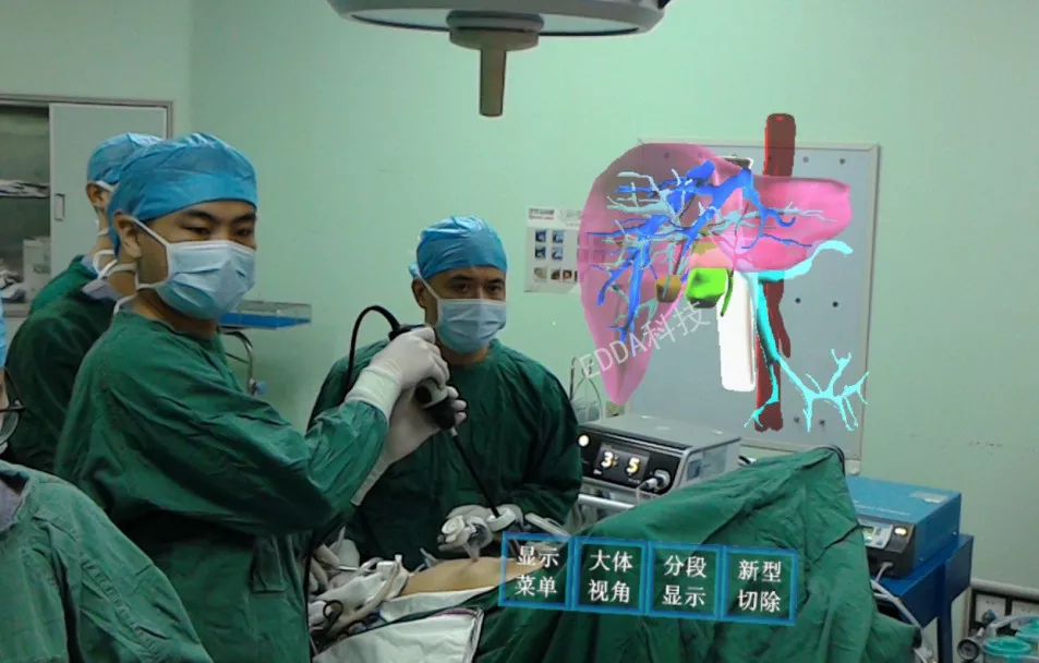 手术情况:术前,福建省立医院肝胆外科严茂林教授团队运用IQQA平台进行智能三维重建分析及精准手术规划,准确定位患者右肝V段占位性病变。术中,通过“量化透视”眼镜,实时观察患者三维重建影像,清晰准确地了解病灶与周围Glisson鞘、肝静脉之间的三维空间关系,IQQA QMR全定量现实虚拟系统将肝脏内的静脉、动脉、胆管分别用不同的颜色进行标记,做到了术中所见与三维重建真正的一一对应。